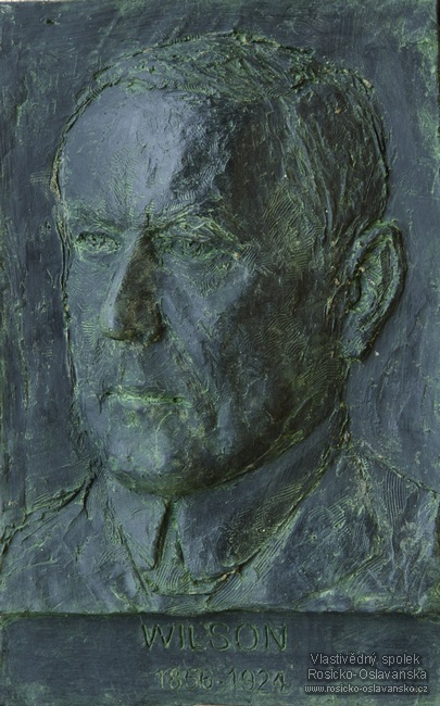 Woodrow Wilson (detail pravé plakety). Autorkou portrétu je studentka ateliéru figurálního sochařství Akademie výtvarných umění v Praze Irena Armutidisová ml.