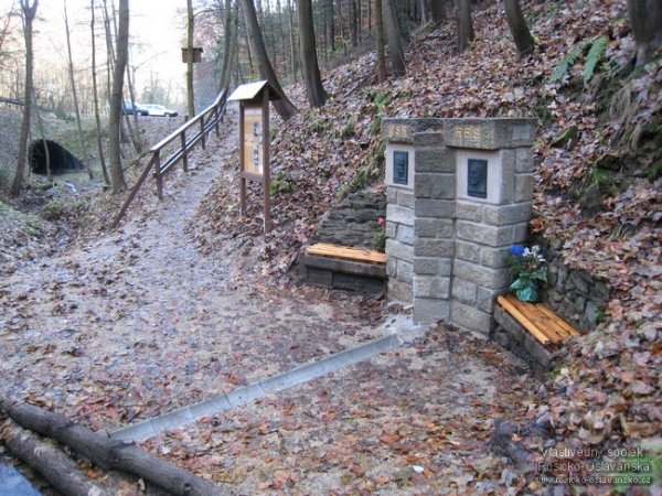Studánka v podzimní náladě po slavnostním otevření už 15. listopadu. Vedle zídky ještě zůstaly květiny, které zakoupila Romana Sedláčková z gymnazijního sboru.